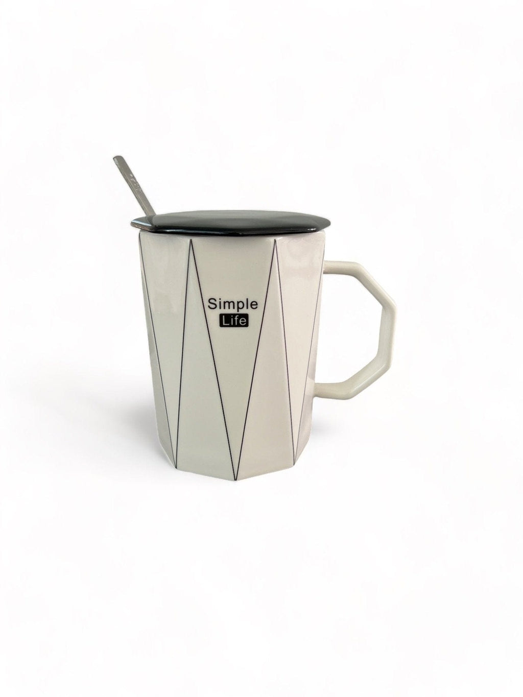 Tasse en céramique géométrique blanche " Simple Life" avec cuillère en métal et couvercle céramique - Design moderne - 250 ml